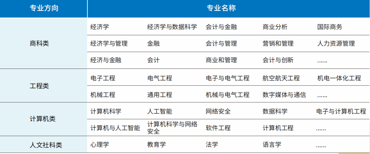 ·专业广泛:涵盖商科类、理工科、人文社科类、艺术类等多个领域的专业,学生可以根据自己的兴趣和职业规划选择适合的专业方向。
